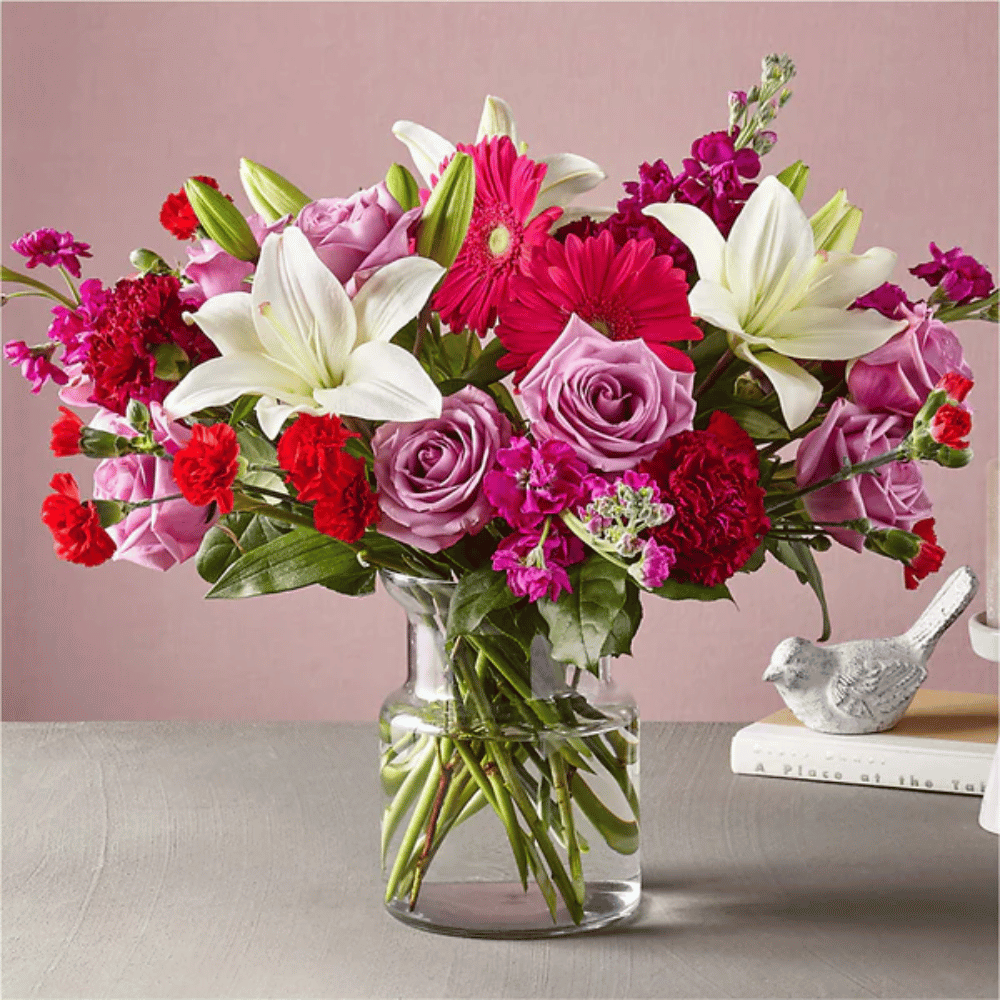 Give everything and more to the one who captured your heart. The All My Love Bouquet features refreshing pops of color in the hot pink gerbera daisies, while the crisp lilies in a clear, glass vase are effortlessly timeless and elegant.