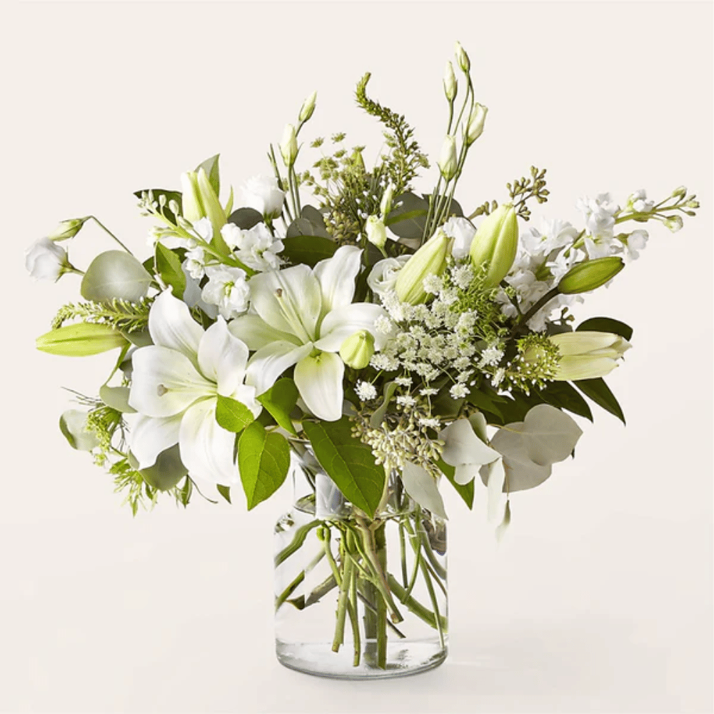 An illuminating array of florals brings an air of elegance to any room it's placed. This arrangement features refined florals like lilies, Queen Anne's Lace and Veronica in a clear glass vase to add a touch of sophisticated style to your special occasions.