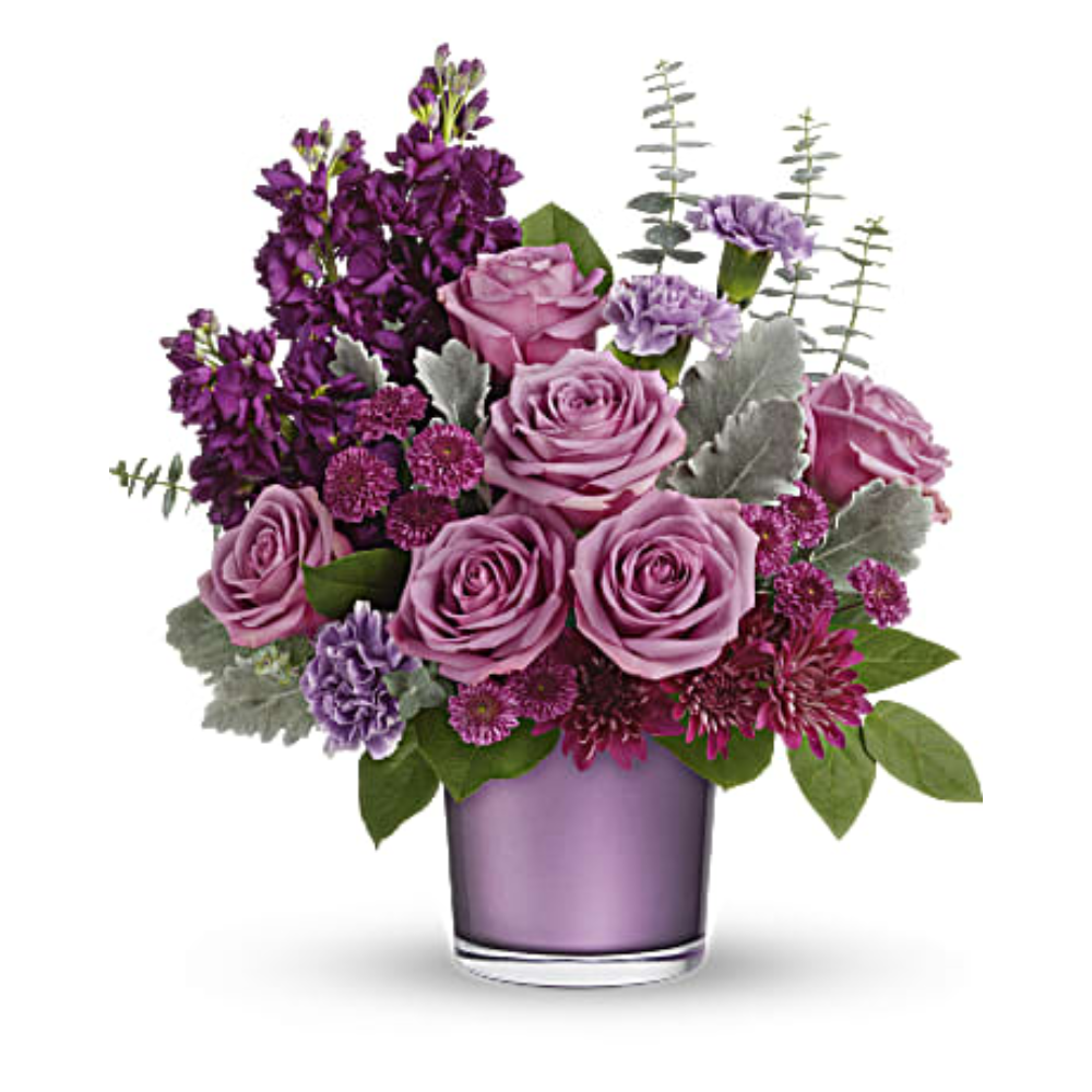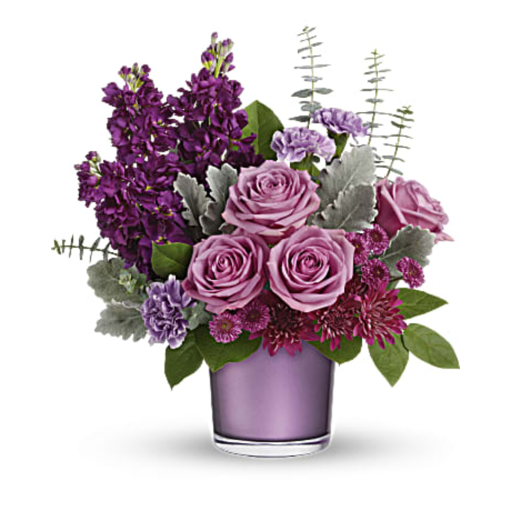 This pretty bouquet includes lavender roses, lavender carnations, lavender stock, purple cushion spray chrysanthemums, purple button spray chrysanthemums, dusty miller, seeded eucalyptus, and lemon leaf.