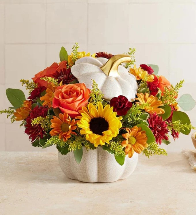 A plentiful mix of blooms gives our autumn arrangement an undeniable charm. Loosely gathered in fall tones, it perfectly contrasts our modern-styled pumpkin. Featuring a white satin finish, crackle detail, and rich golden accents, this harvest-inspired container is perfect for repurposing. This is a large arrangement. Our florists hand-design each arrangement, so colors and varieties may vary due to local availability.