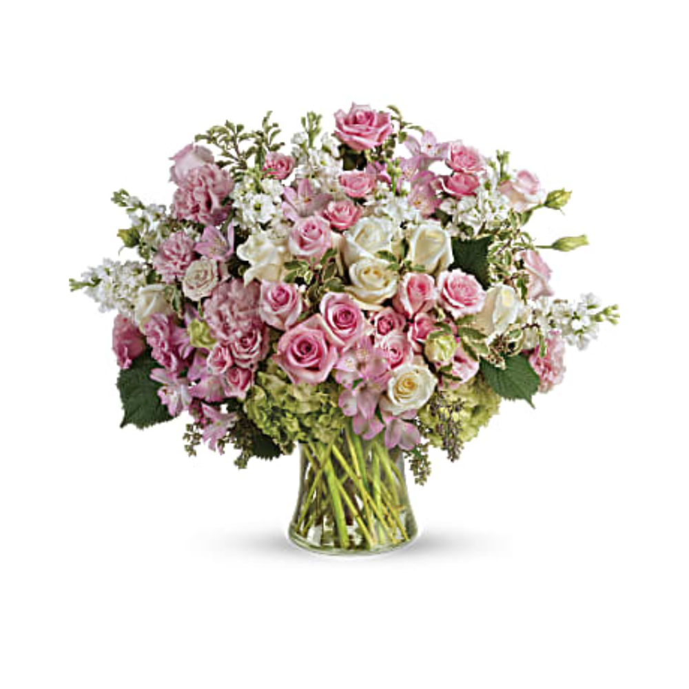 • This breathtaking bouquet features green hydrangea, pink roses, white roses, pink spray roses, light pink alstroemeria, pink lisianthus, white stock, pitta negra, and seeded eucalyptus.