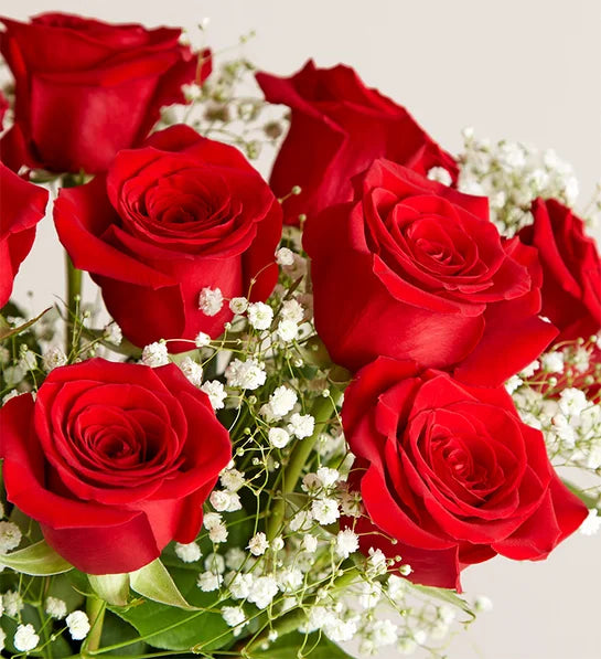 • All-around arrangement with premium red roses, baby’s breath and greens