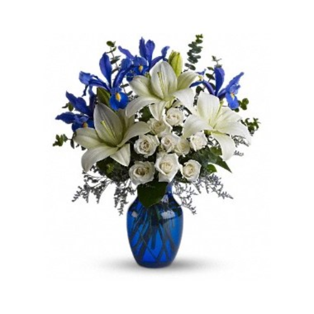 As open and bright as a winter’s sky, this exquisite mix of white and blue blossoms would make a stunning birthday gift, or a superb Hanukah present for a favorite friend or family member. An eye-catching selection.