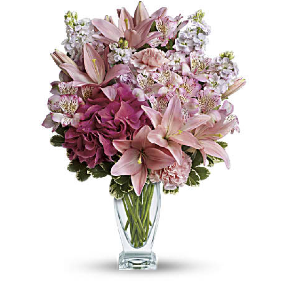 Includes pink hydrangea, asiatic lilies, alstroemeria, carnations and stock, accented with fresh greens.