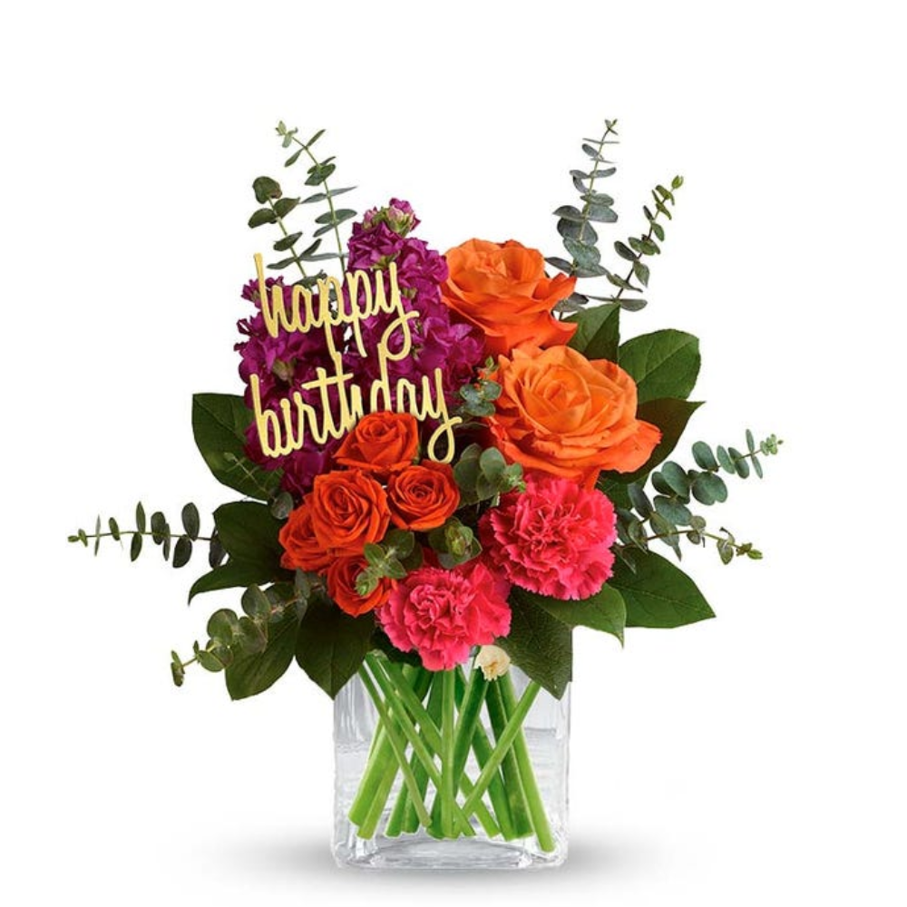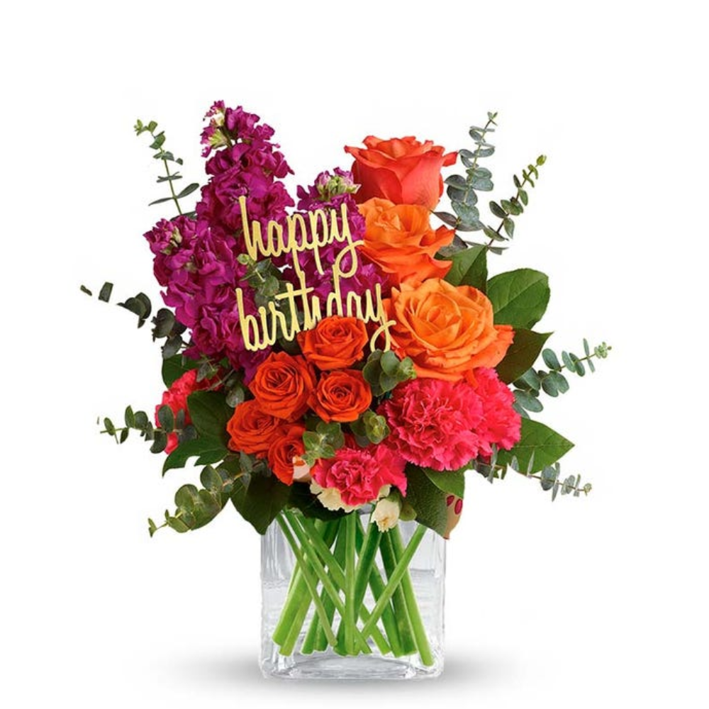 Fill someone’s birthday with color! This brightly colored birthday flower bouquet is created with mixed floral stems including orange roses, pink carnations and orange spray roses. All the beautiful flowers are hand arranged by a florist near you in a glass cube vase. Note: Happy Birthday pick may vary depending on local florist’s availability.