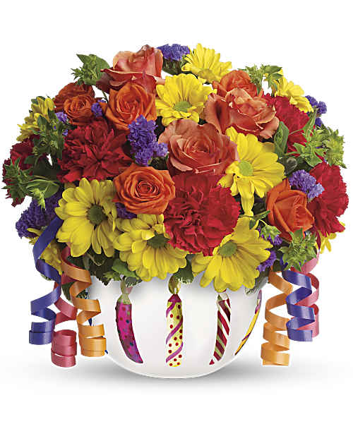 There's no mistaking this bouquet for anything but a Happy Birthday wish! With its colorful streamers and birthday candle design, this bright arrangement is perfect as a great party centerpiece or to send to a loved one far away.