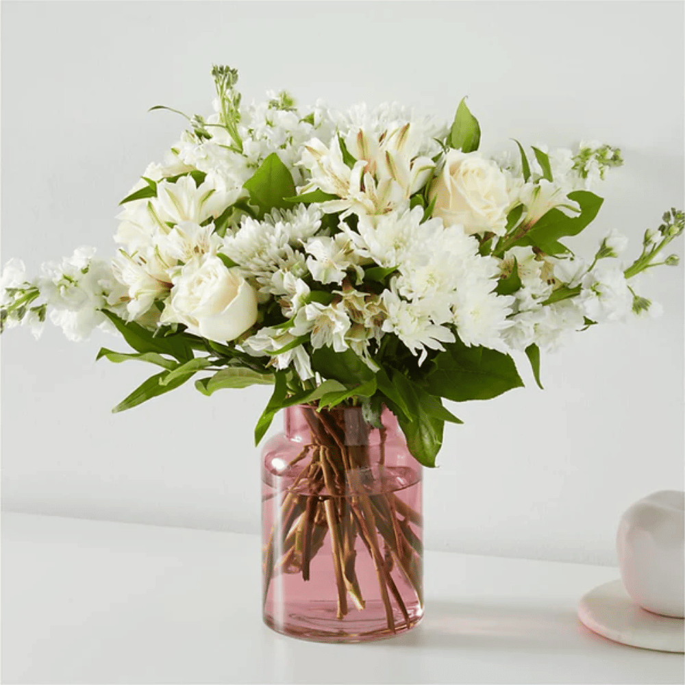 White roses, alstroemeria, cushion pompons and a blush vase turn this bouquet into a meaningful and memorable accent in any space – with a container that flatters any flower.