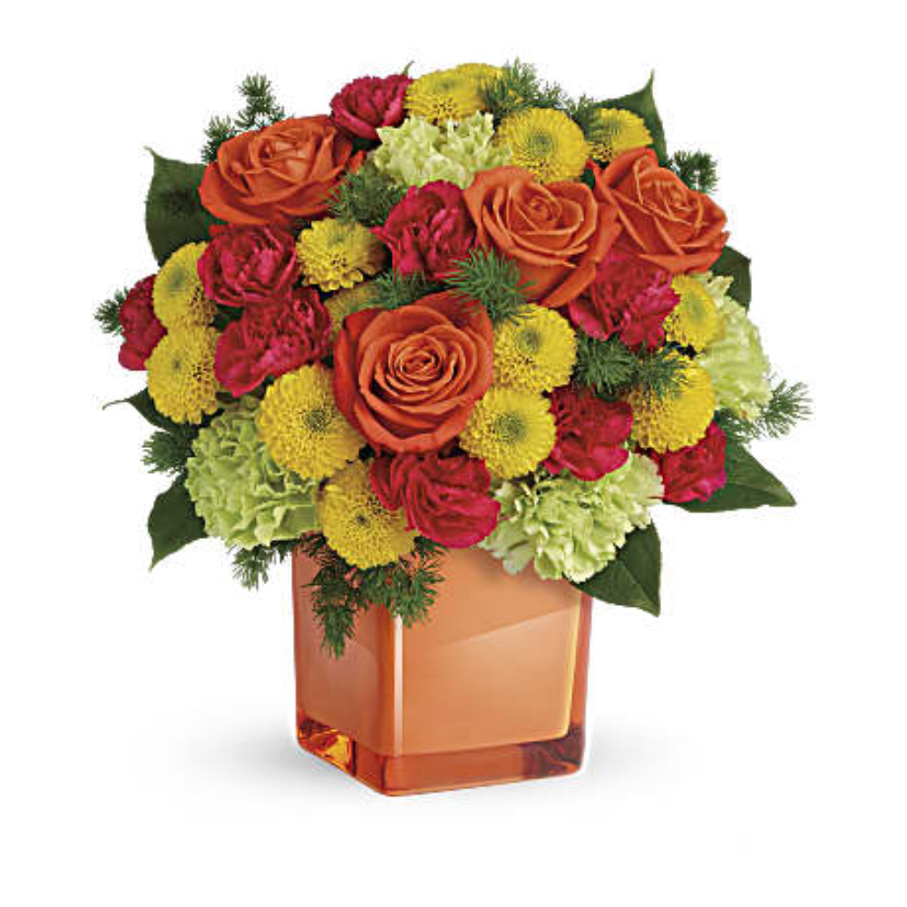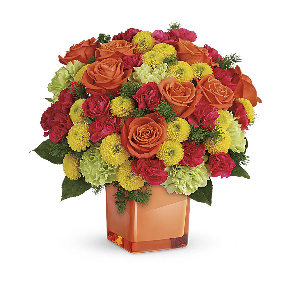 Smile awhile! This spirited mix of happy citrus blooms will brighten the room, and their mood. The cheerful bouquet of roses, carnations and mums is hand-delivered in an exclusive Color Splash cube.