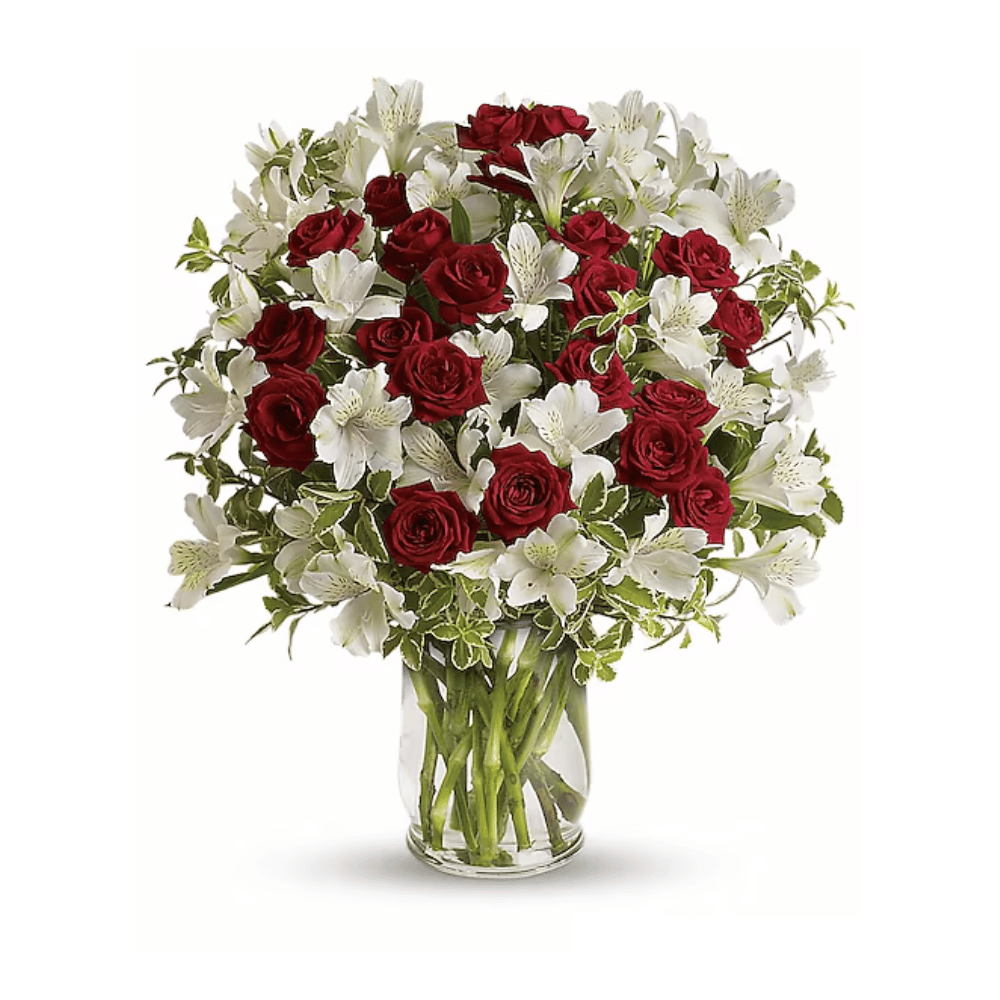 Endless roses, endless romance! Make a statement with our stunning bouquet of red roses with snowy white blossoms, delivered in a glass hurricane vase that will forever remind her of your love.