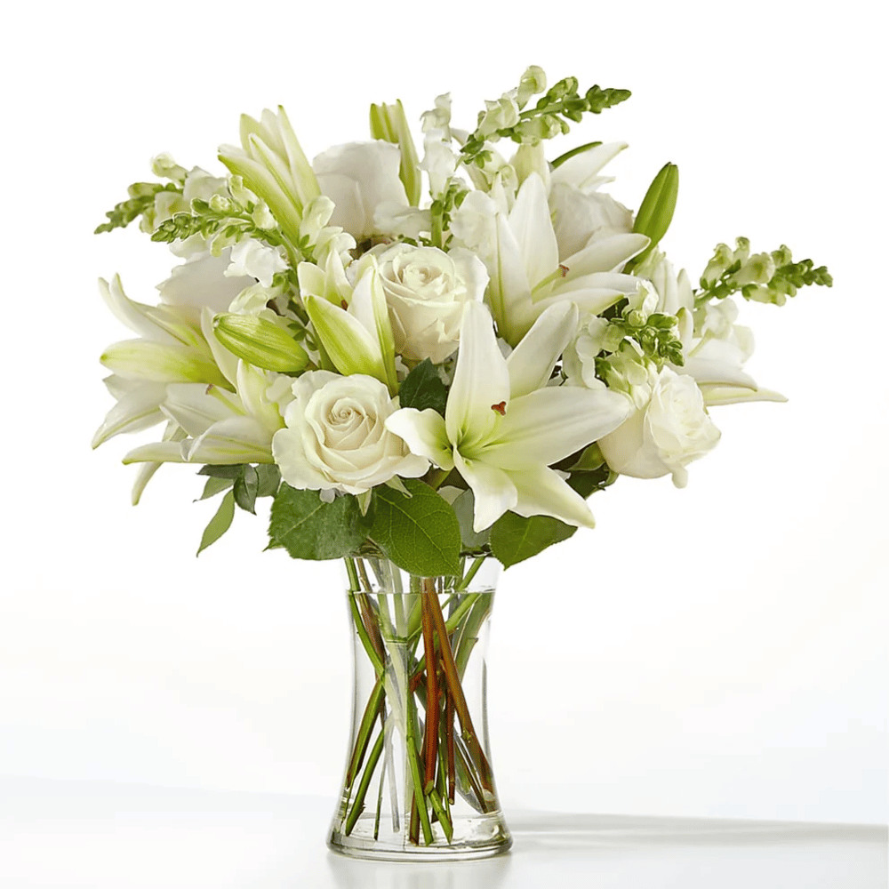 An exuberance of bright and beautiful white blossoms provides an exquisite way to deliver your expressions of sympathy and comfort. This life affirming tribute combines white roses, snapdragons and Asiatic lilies accented by lush greens arranged in a clear glass 8" vase. An excellent choice for a wake, funeral service or for sending your condolences to the home of grieving family or friends.
