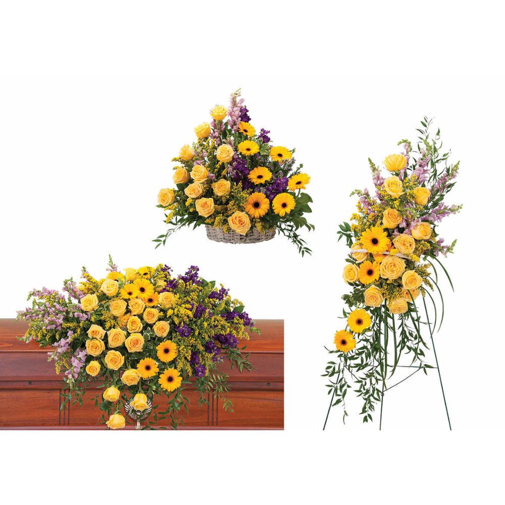 Casket spray, standing spray and basket in bright vivid colors.