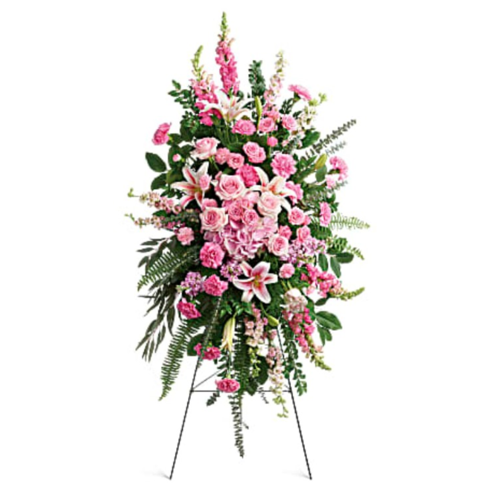 This glorious spray includes pink hydrangea, light pink roses, light pink spray roses, pink oriental lilies, pink carnations, miniature light pink carnations, pink larkspur, pink snapdragons, pink stock, huckleberry, sword fern, asparagus plumosus and greenery. Delivered on a wire easel.