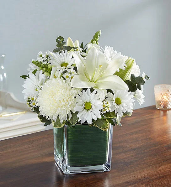 • Artistically designed by our florists in a classic clear glass cube lined with a Ti leaf ribbon; vase measures 5"H x 5"D
