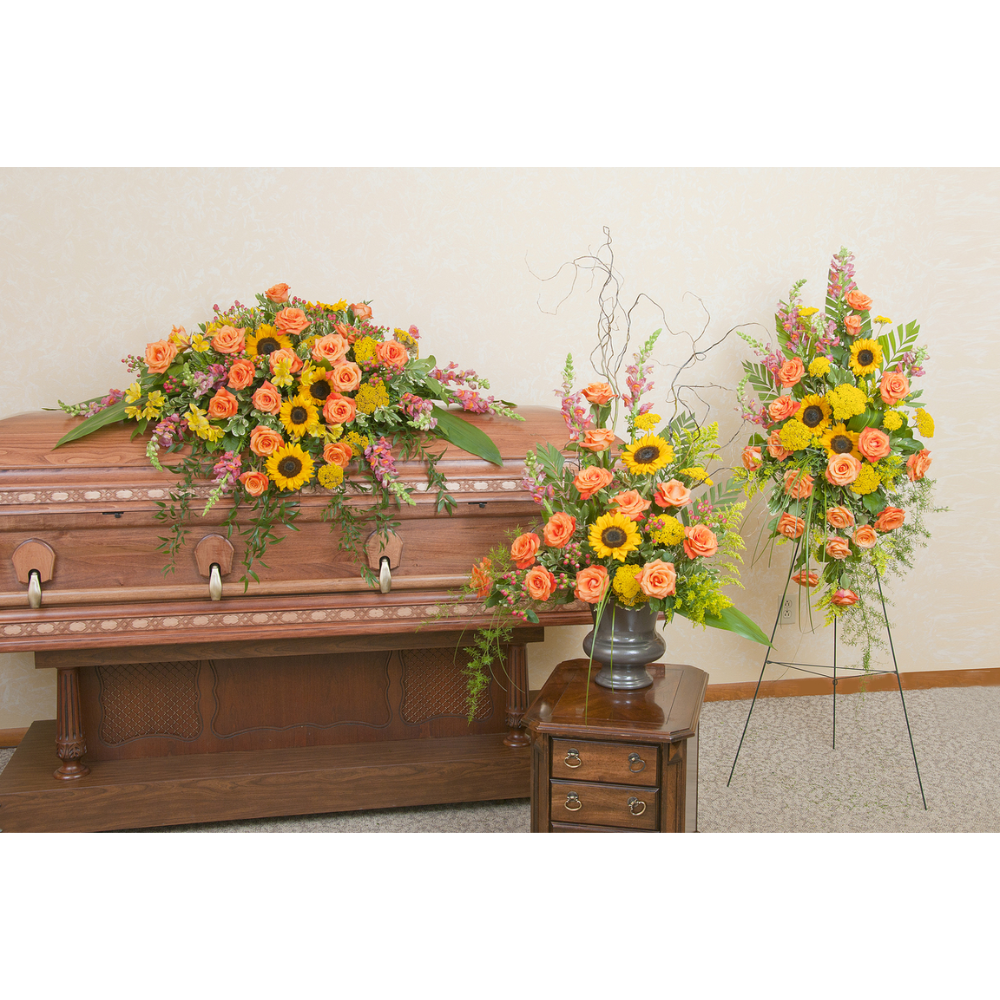 Includes a casket spray, standing spray and urn design in the warm colors of a sunset.