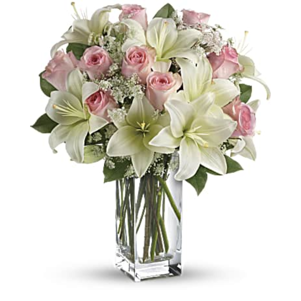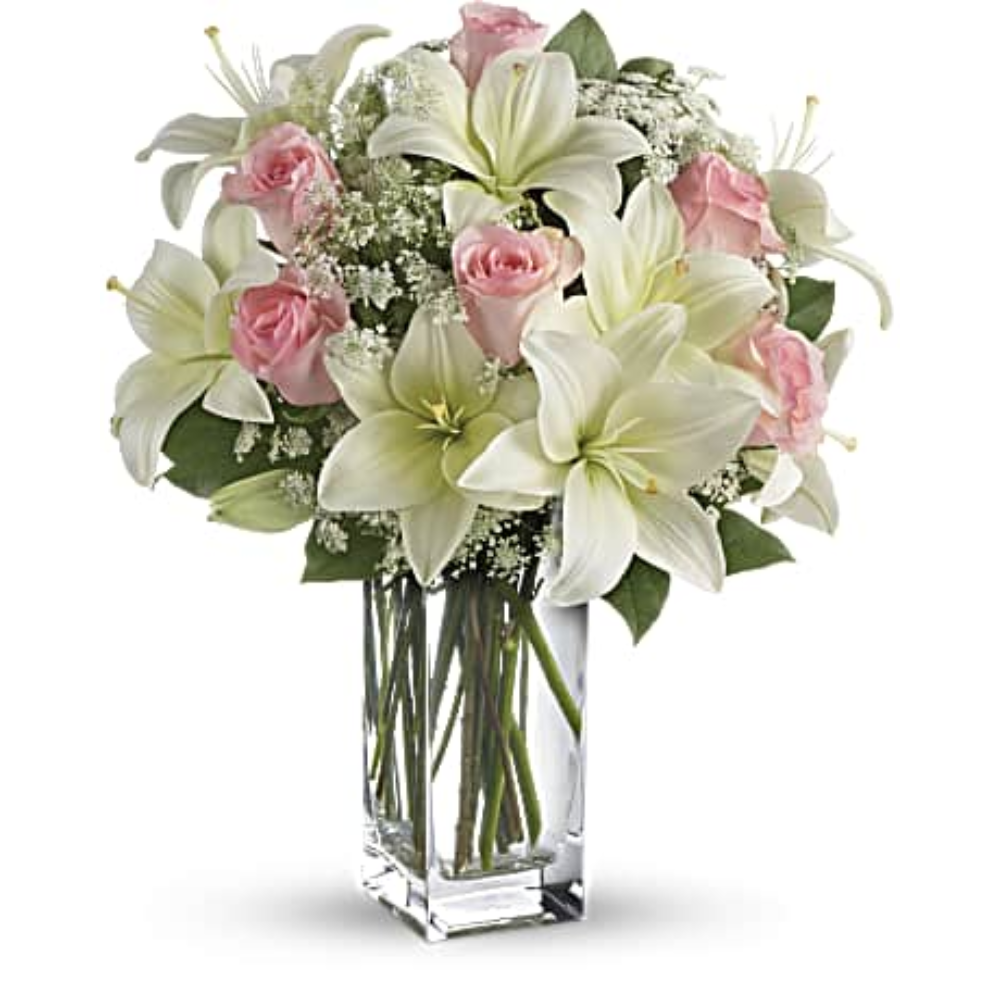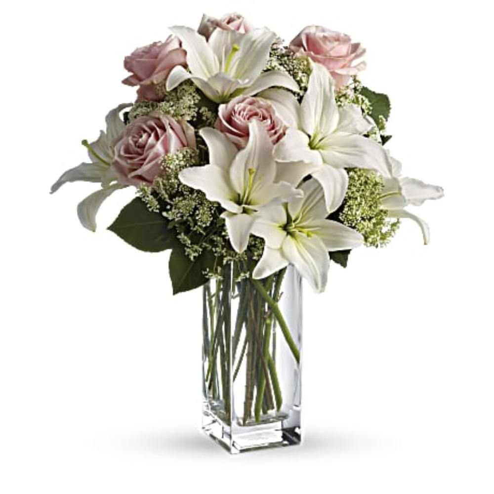 Stunning in its simplicity, this innocent harmony of light pink roses and snow white lilies are a heartfelt way to send your very best. The classic, clear rectangular glass vase keeps the focus on the heavenly beauty of the blooms.