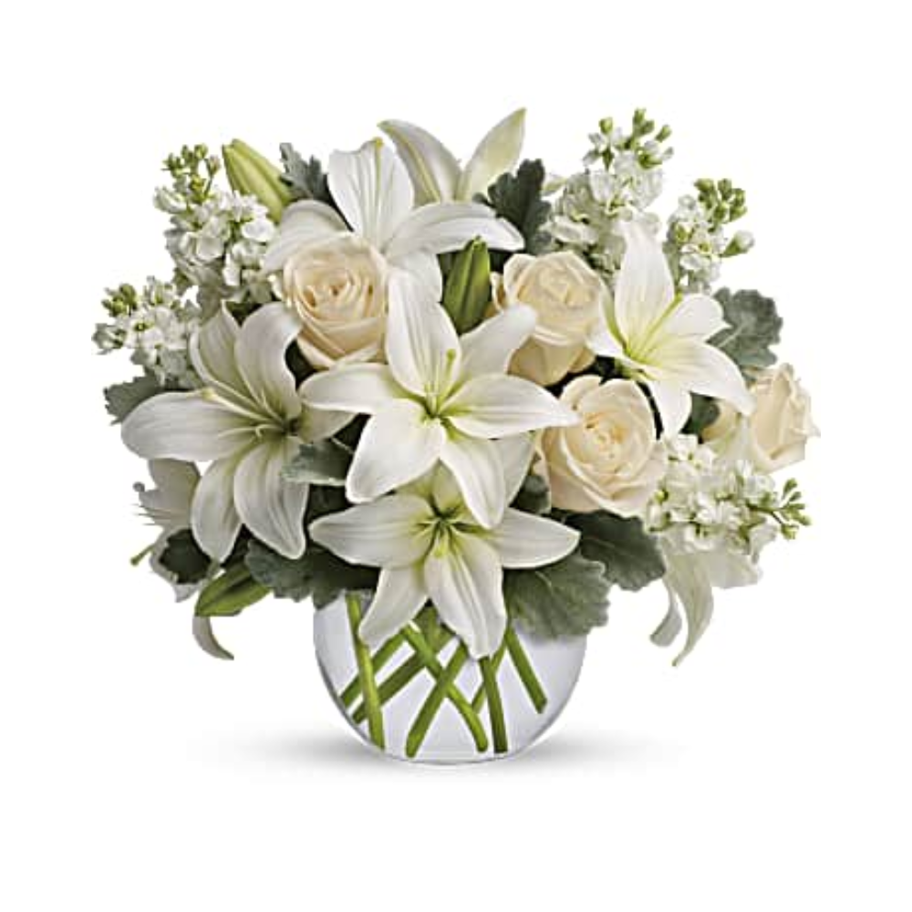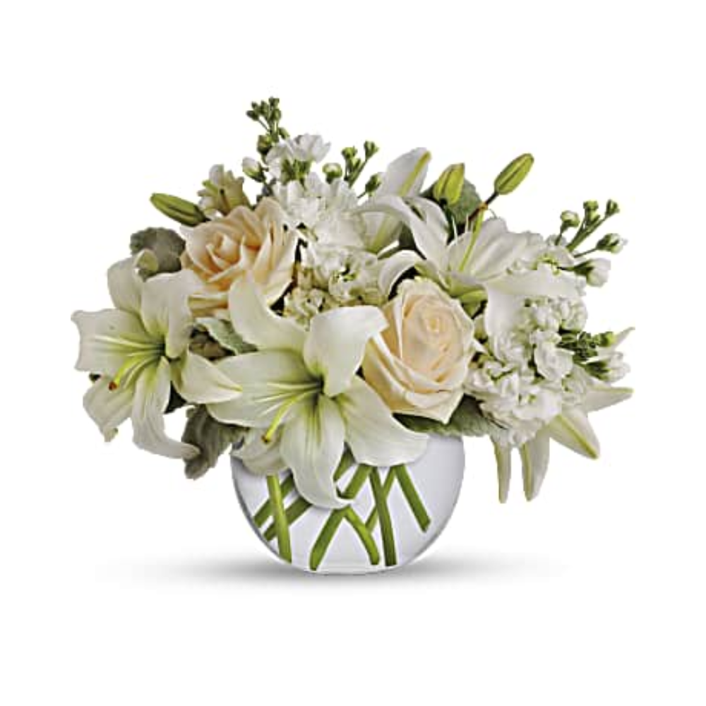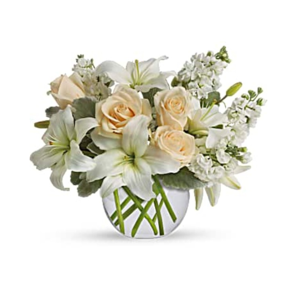 Crème roses, white asiatic lilies and stock stem are incredibly arranged in a bubble vase. When it comes to bouquets, this is definitely the right way to do white.