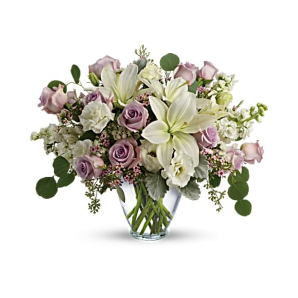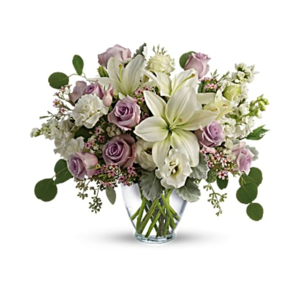 Luxe in love! Pale lavender roses, creamy white lilies and delicate greens create a soft sweet bouquet that’s as tender as your feelings.