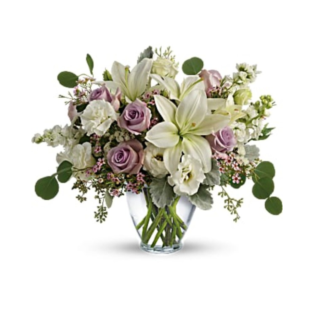 • Lavender roses, white asiatic lilies, white lisianthus, white stock, lavender waxflower, and white sinuata statice are accented with dusty miller, seeded eucalyptus, and silver dollar eucalyptus.