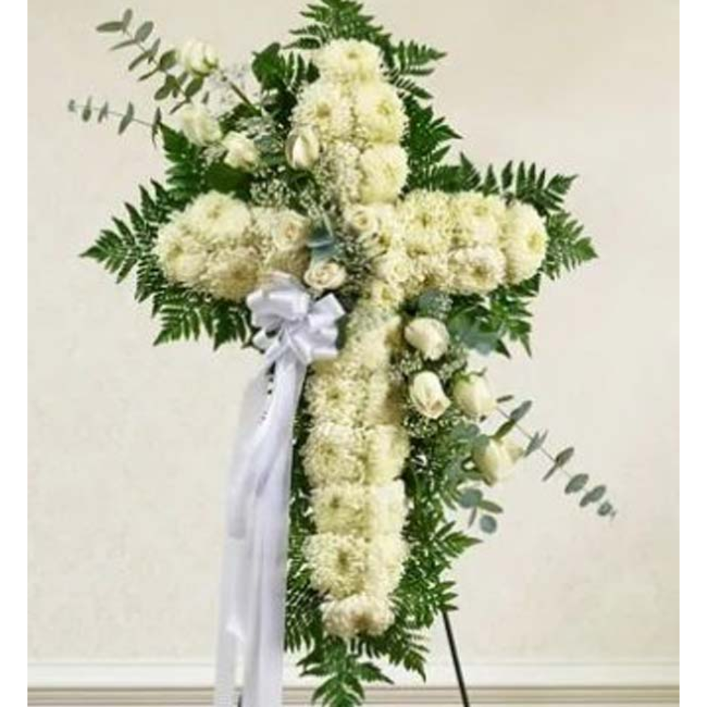 Send a beautiful and striking floral tribute that shows your support and love during this difficult time. This standing spray arrangement in the shape of a cross is created from fresh white roses, football mums, greenery and floral accents. Traditionally sent directly to the funeral home by family members or friends and displayed on a stand.