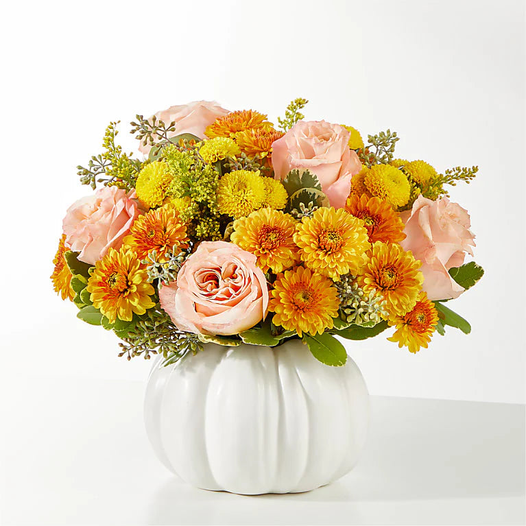 The perfect transition into the fall season will arrive at their doorstep with the Peachy Pumpkin, a soft palette of butterscotch, yellow and peach florals to celebrate the start of autumn.