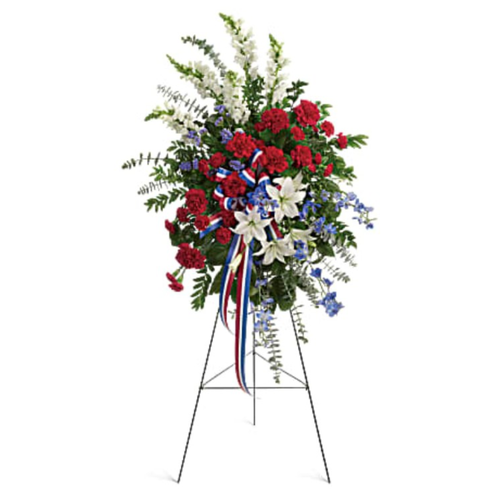 • Adorned with yards of multicolored patriotic ribbon, this easel-mounted standing spray features flowers such as red carnations, white asiatic lilies and snapdragons, and blue delphinium, along with an assortment of greens.