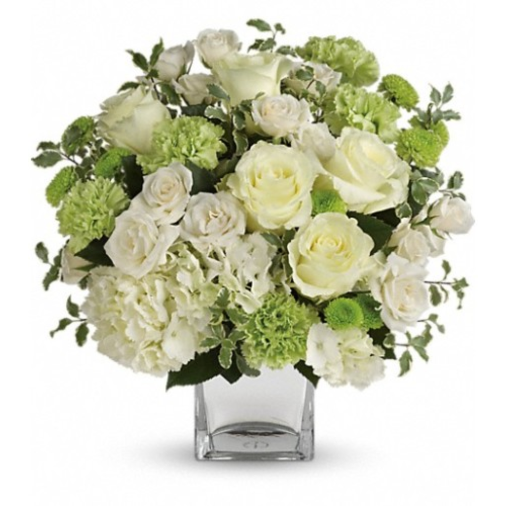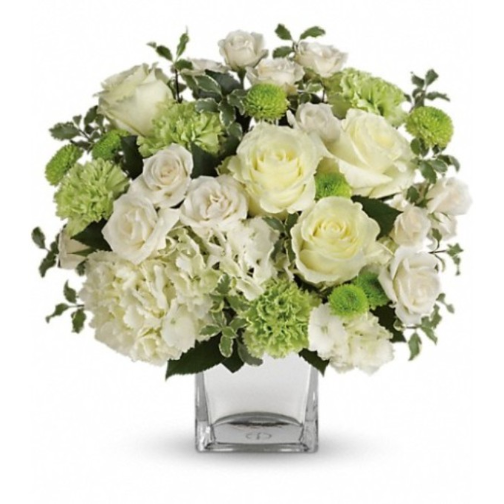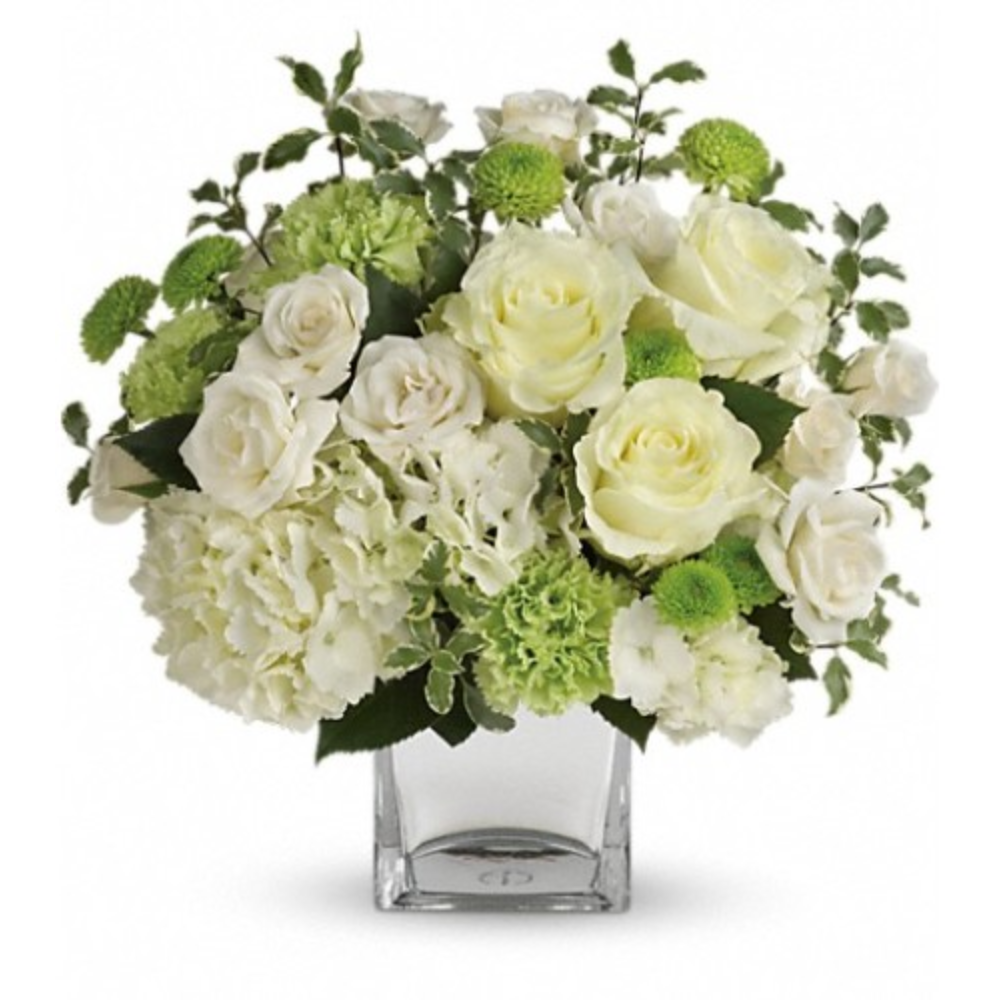 Let your love shine! No matter the recipient or the occasion, this stunning monochromatic mix of hydrangea and roses, hand-delivered in a silver cube, is destined to delight and inspire.