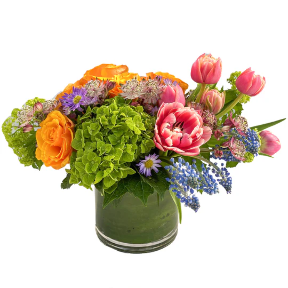 A gorgeous low and lush garden-style designer's choice arrangement composed of vibrant spring blooms.