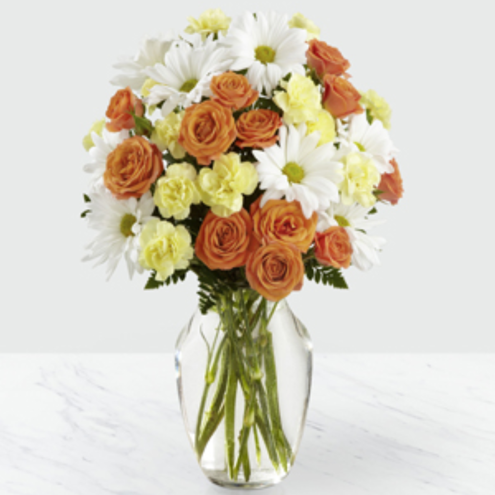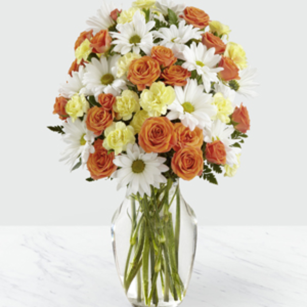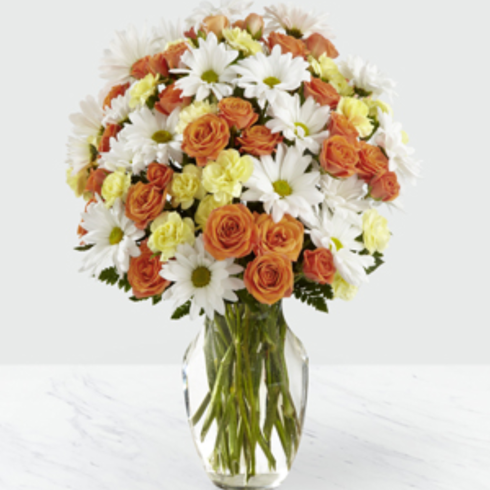 The Sweet Splendor Bouquet has a citrus sweet vibe that is set to help you celebrate your special recipient! White traditional daisies provide a perfectly beautiful background for the bold colors of the orange spray roses and yellow mini carnations to pop, making this an unforgettable fresh flower arrangement.
