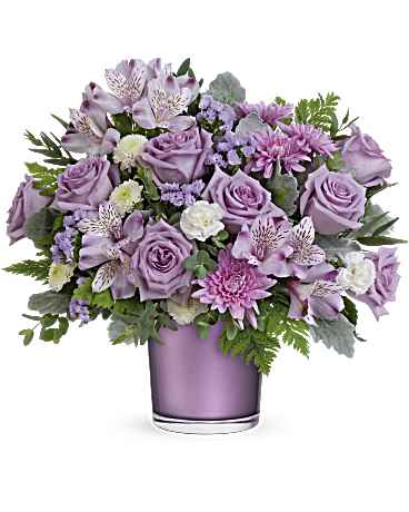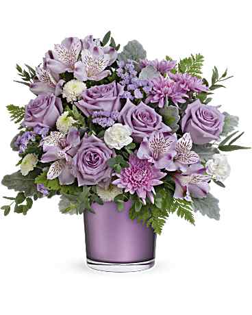 Experience elegance with a bouquet featuring lavender roses, alstroemeria, white carnations, white button chrysanthemums, lavender cushion chrysanthemums, lavender sinuata statice, dusty miller, leatherleaf fern, and parvifolia eucalyptus, all beautifully arranged in Teleflora's Purple Amethyst Polished Gem Cylinder.
