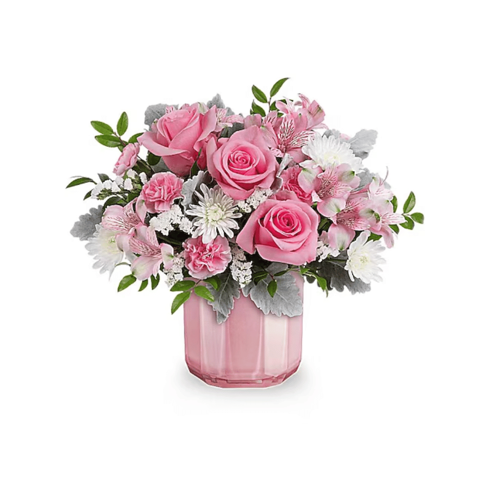 This charming Valentine's Day bouquet features pink roses, pink alstroemeria, miniature pink carnations, and white cushion spray chrysanthemums, arranged with dusty miller and huckleberry. It's delivered in the Blushing Gem vase.