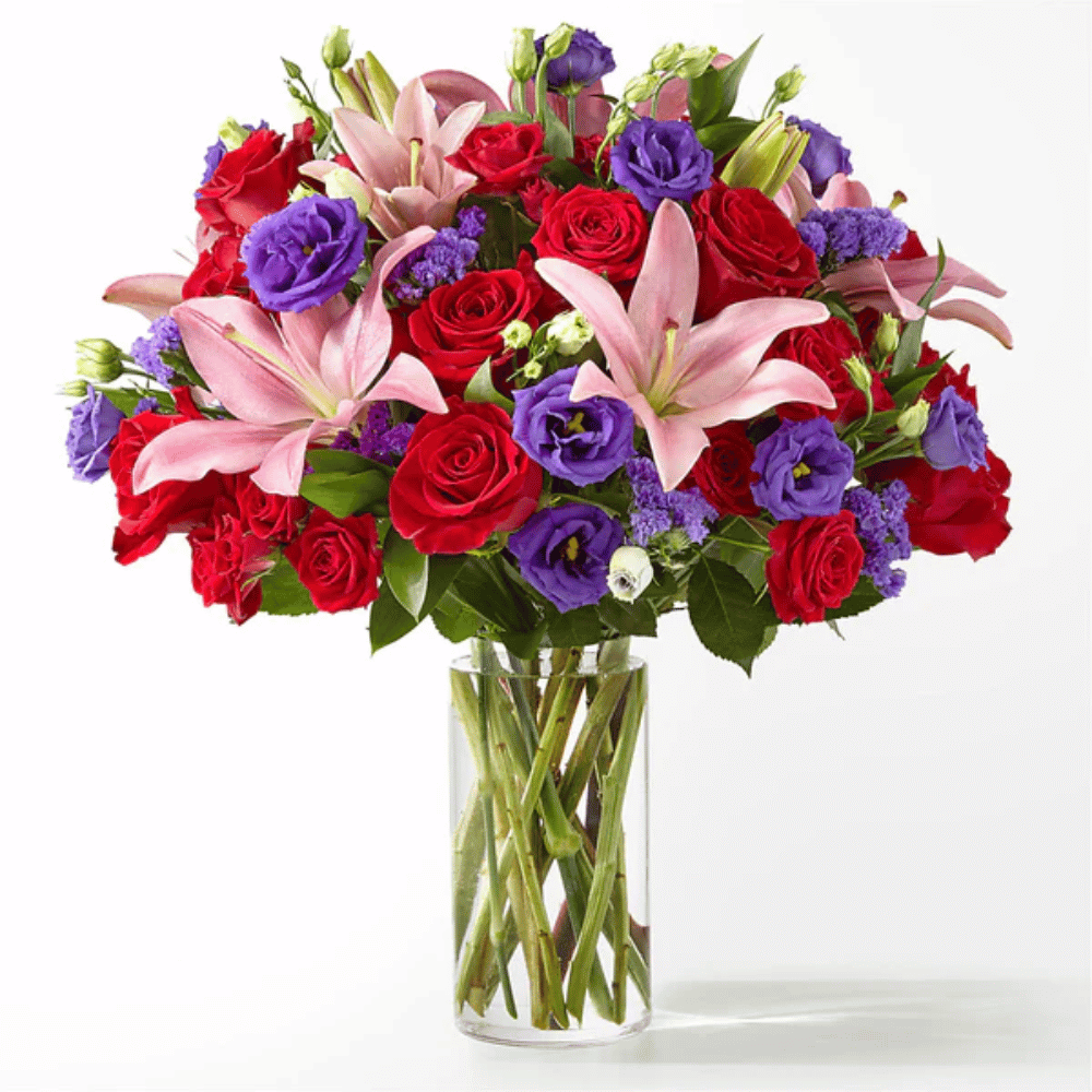 This dreamy jewel toned bouquet combines bold color and eye catching texture to make a statement. Featuring a thoughtful array of both roses and lilies, this dazzling assortment is bound to impress your recipient.